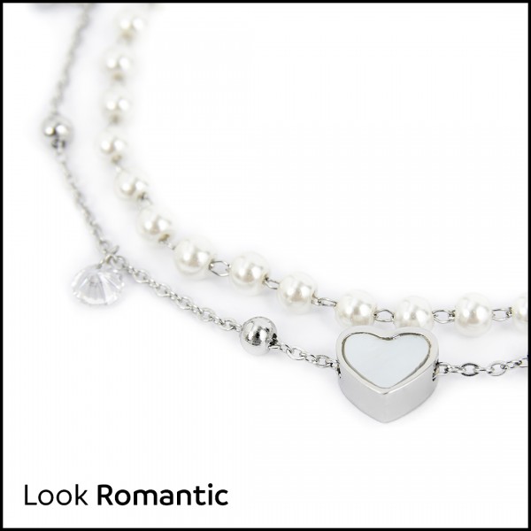 bracciale doppia catena perle con cuore cristalli in acciaio