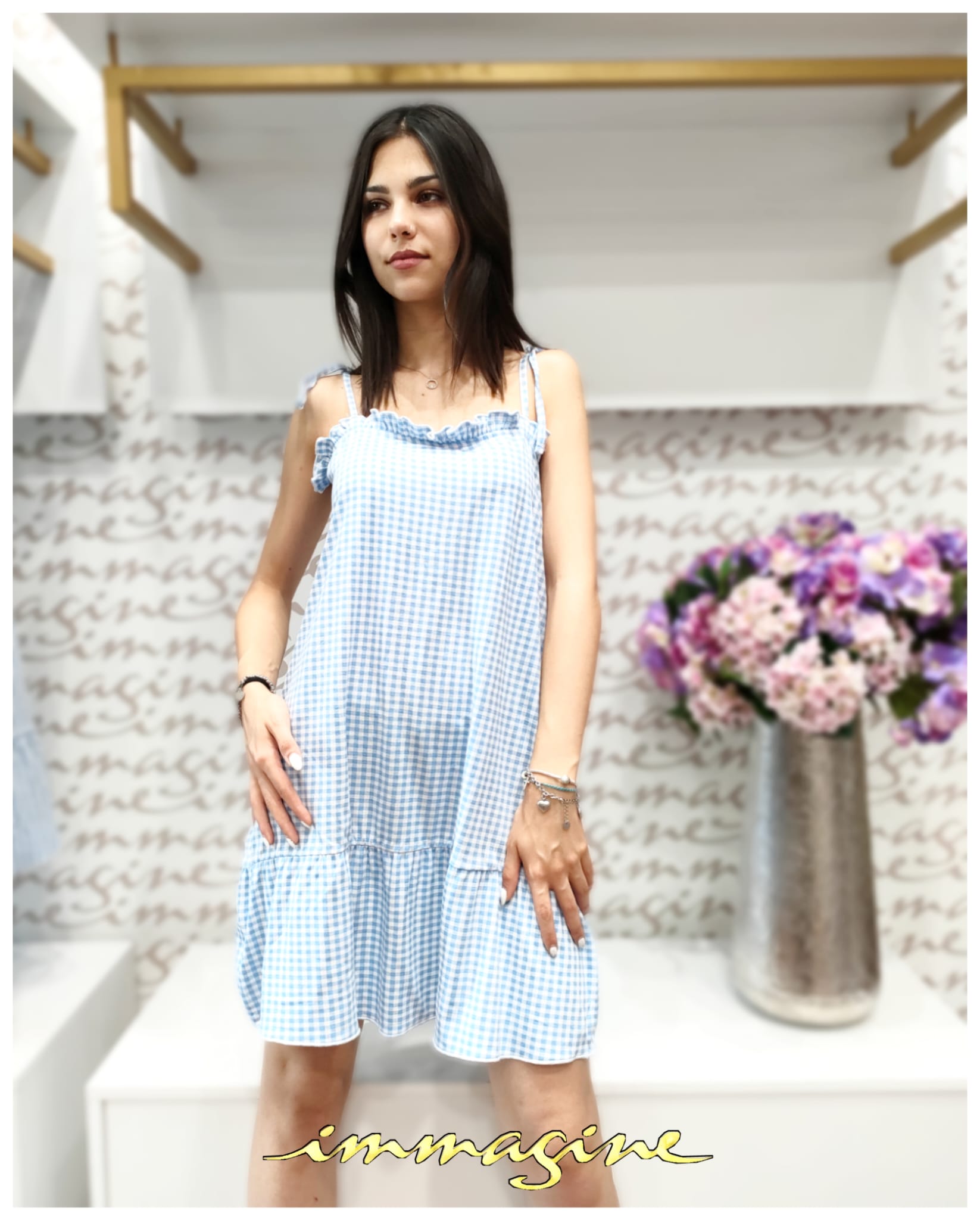 Canotta spalla stretta a quadretti bianco/celeste
