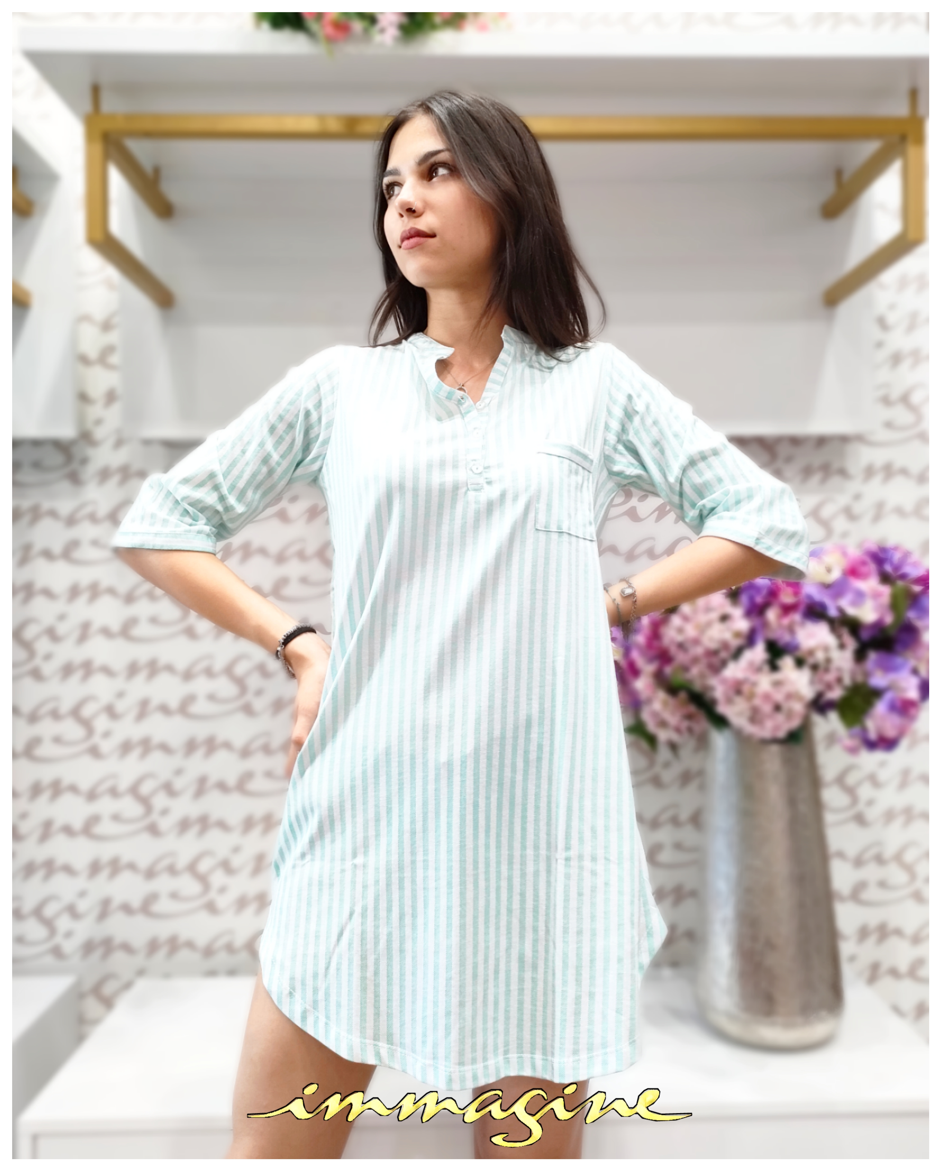 Canotta manica tre quarti collo Serafino a righe bianco- verde acqua 100% cotone ideale anche come homewear