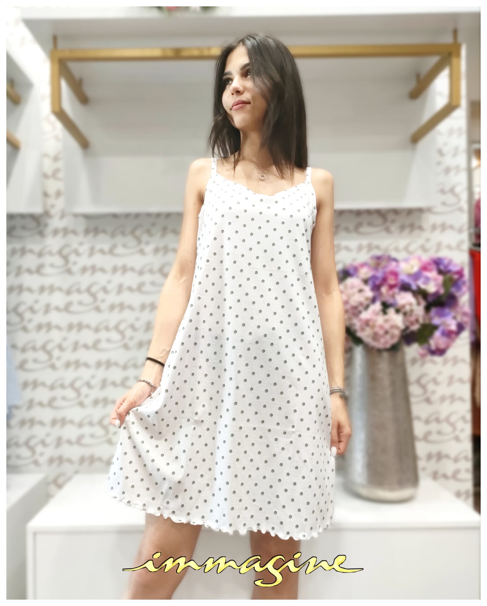Canotta spalla stretta sia da notte che homewear. 100% cotone. Rosa pastello con pois verde.